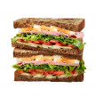 곡물이 가득 담긴 브라운식빵에 햄, 에그슬라이스, 신선한 야채를 올린 든든 샌드위치
