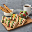 고소한 호밀빵에 닭고기, 베이컨, 계란이 가득한 3단 클럽 샌드위치와 싱그러운 샐러드를 함께 즐기는 브런치