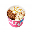 무지방 우유로 만든 요거트 아이스크림에 쿠키 크럼블, 아몬드 슬라이스, 카라멜 소스를 더한 고소한 조합