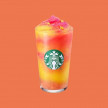 과즙 가득한 화이트 피치와 핑크빛 망고 용과 토핑의 카페인 프리 과일 블렌디드 음료입니다.